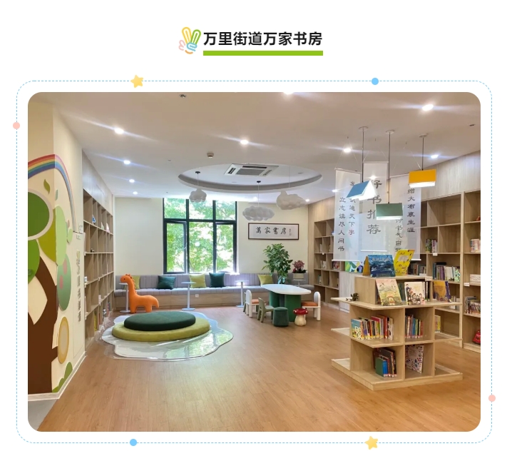 万家书房总面积280平方米,现有藏书3500册。共有悦读馆、绘本馆、自习室、蛙心漫游馆、多功能活动区五个功能空间,满足不同年龄段孩子和家长的阅读需求。