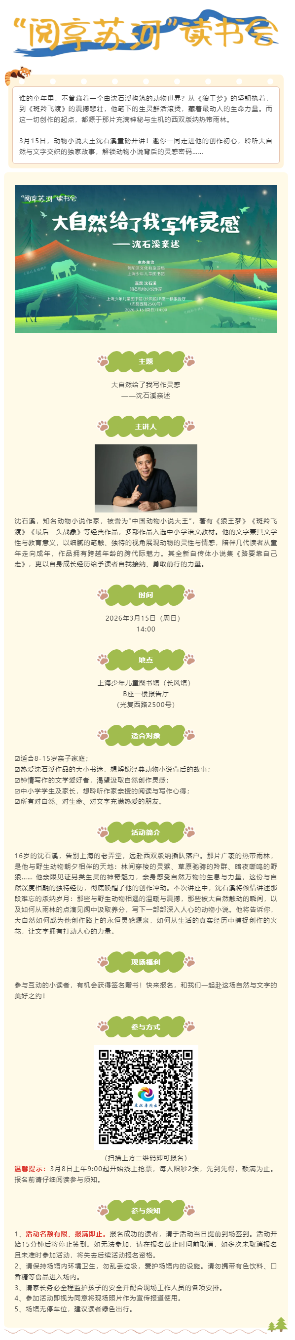 “阅享苏河”读书会重磅开讲!动物小说大王沈石溪亲述自然创作的灵感密码